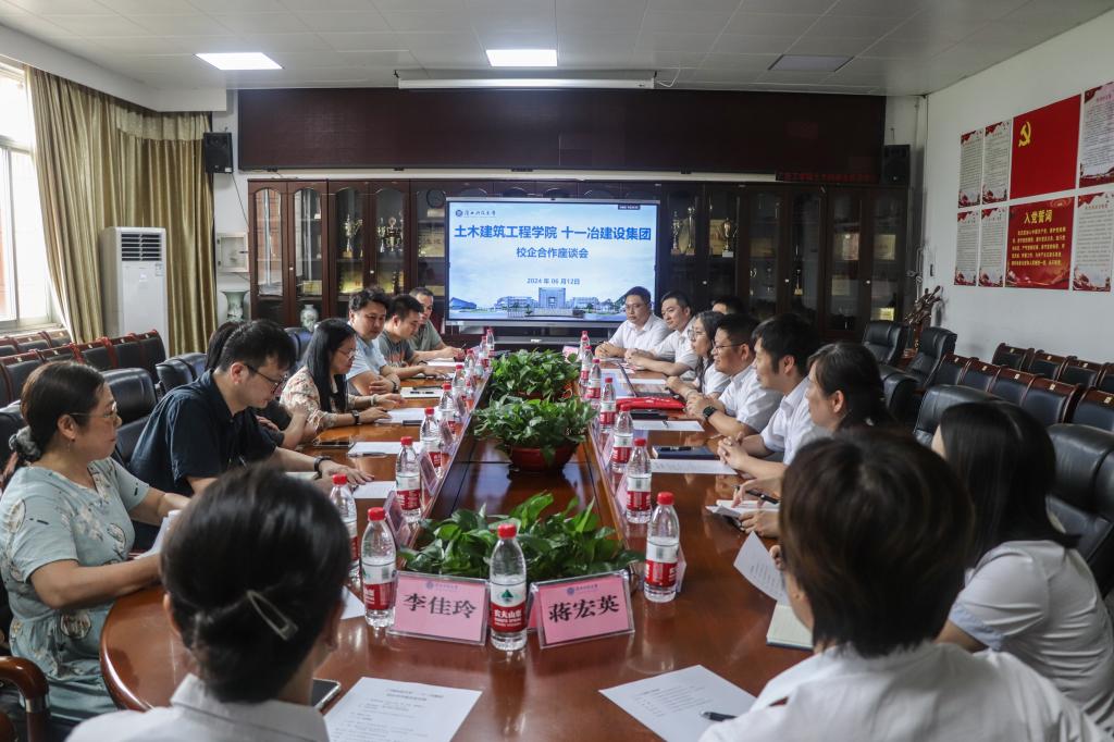 邓宇介绍了学院的基本情况,特别是近年来学院学科发展、人才培养及校企合作等相关情况。李松联介绍了十一冶集团公司的发展历史、品牌和业务范围等情况。双方均表达了希望在之前长期的合作基础上,促进双方在科学研究、成果转化、人才培养等工作向更深、更广、更高层次的发展。座谈会上,双方围绕校企课程、联合培养、就业实习、校园文化活动、人才招聘等方面开展交流。