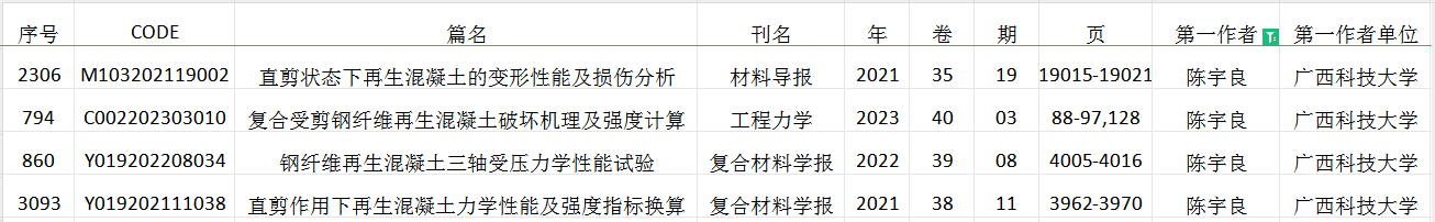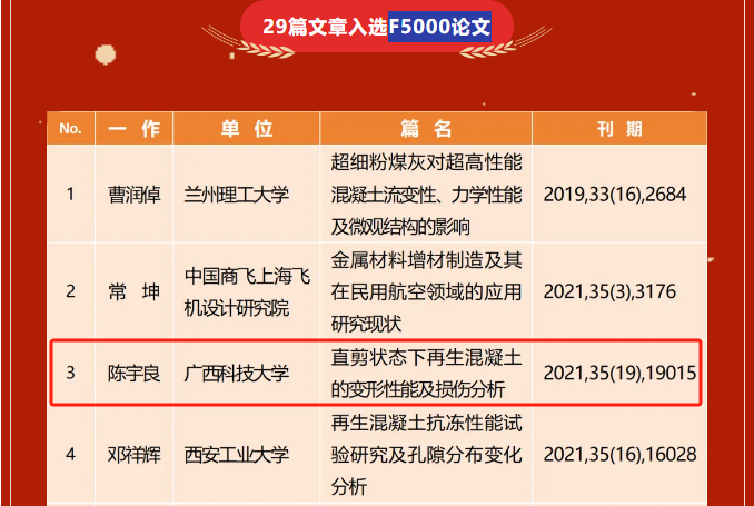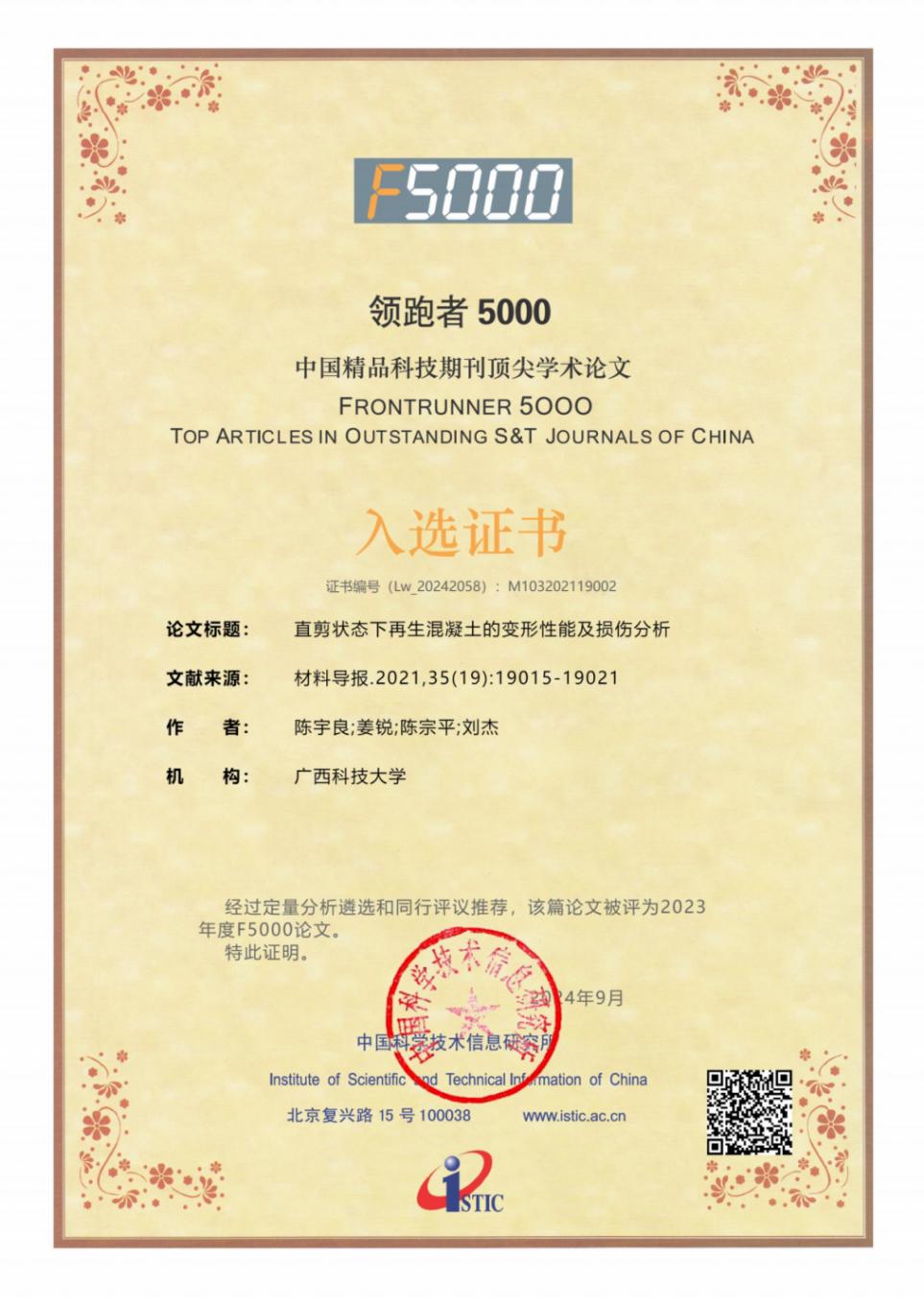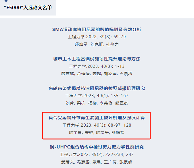 近日,科技部中国科学技术信息研究所发布了“领跑者5000——中国精品科技期刊顶尖学术论文(简称F5000)”入选名单,我院陈宇良副教授学术团队有4篇论文入选。这4篇论文分别为发表在《材料导报》(EI收录、百种中国杰出学术期刊)的论文《直剪状态下再生混凝土的变形性能及损伤分析》,发表在《工程力学》(EI收录、卓越期刊)的论文《复合受剪钢纤维再生混凝土破坏机理及强度计算》,以及发表在《复合材料学报》(EI收录、卓越期刊)的论文《钢纤维再生混凝土三轴受压力学性能试验》和《直剪作用下再生混凝土力学性能及强度指标换算》。