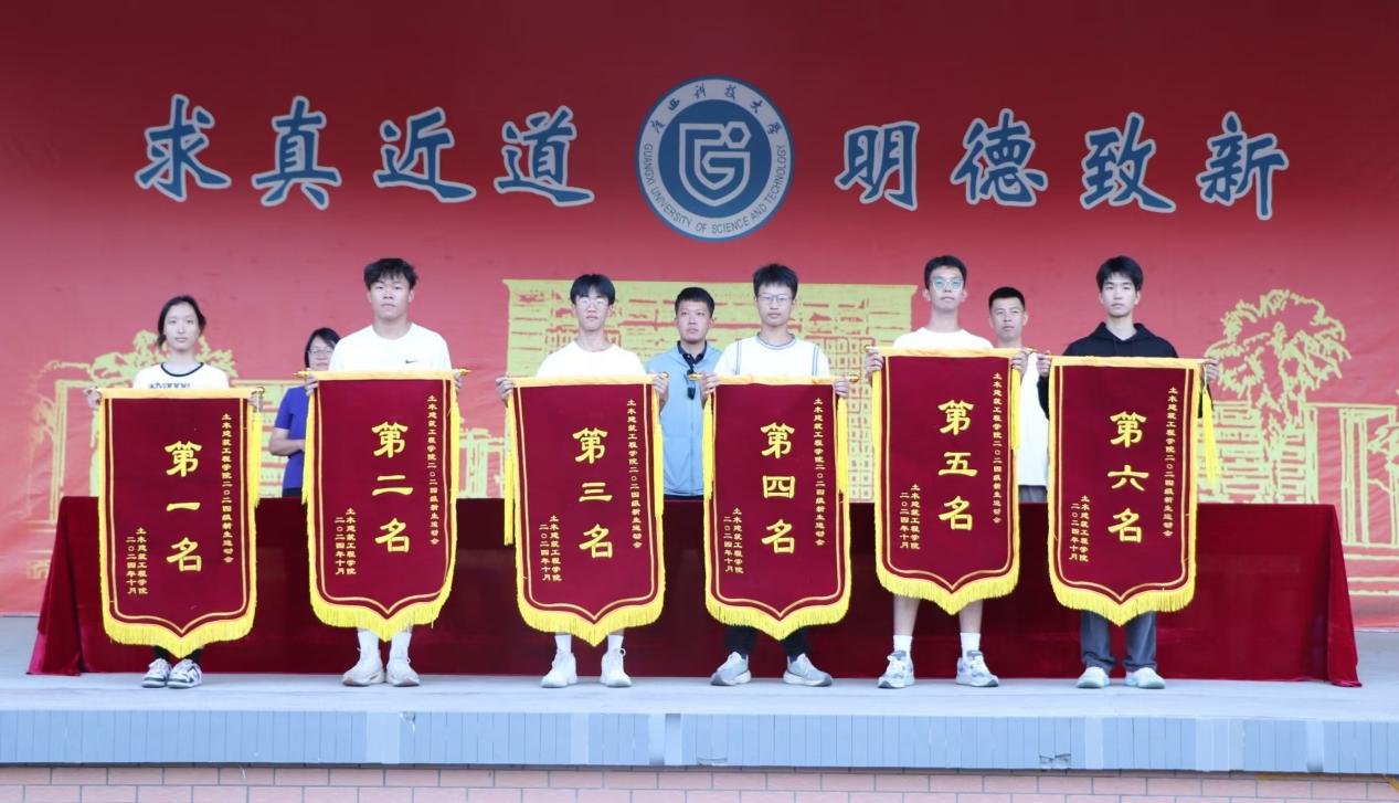 显少年之蓬勃,展体育之精神。经过一天激烈角逐,土建学院裁判长宣布各班级团体总分排名情况。工程241班荣获团体总分第一名,工程242班荣获团体总分第二名,土木241班荣获团体总分第三名,土木242班、土木243班、土木244班分别为第四名、第五名、第六名。参加闭幕式的领导、老师一起为获奖的班级颁奖并合影留念。