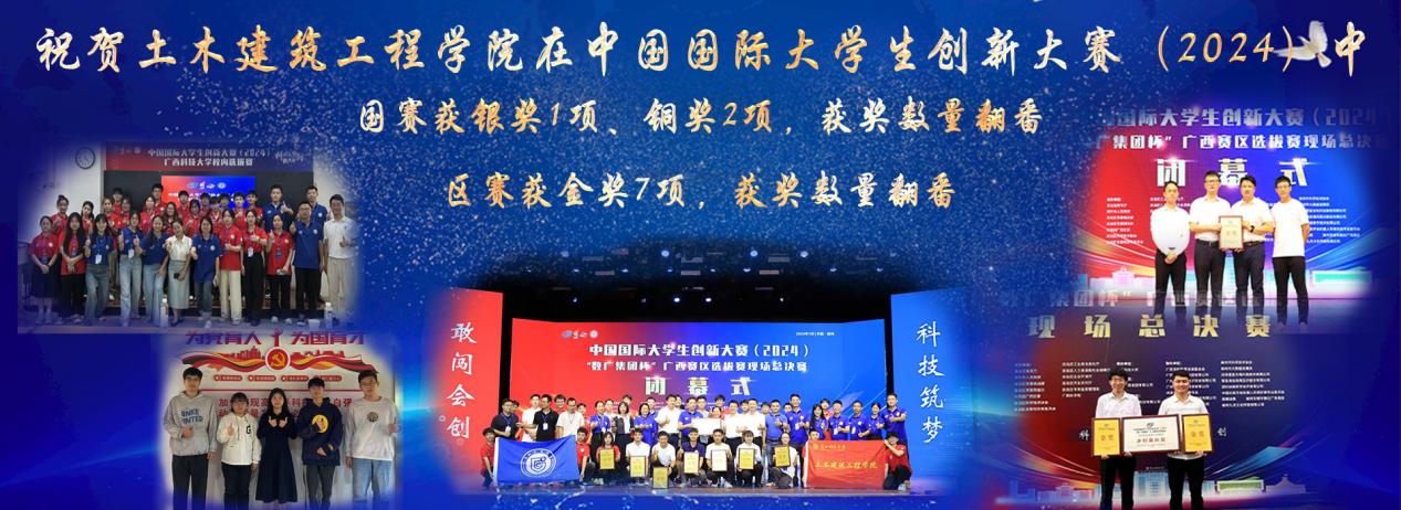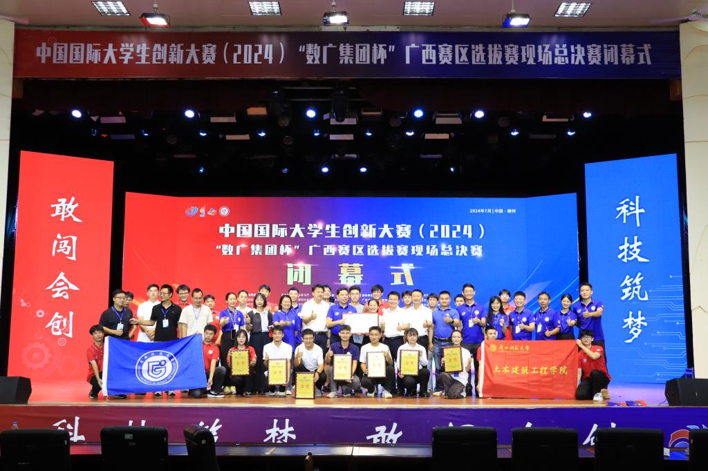 同时,我院今年参加中国国际大学生创新大赛(2024)“数广集团杯”广西赛区选拔赛,获得金奖7项,除获得国赛奖项的3个项目外,其他项目分别是:“浆医生——绿色注浆材料路基注浆加固成套技术”“国花焕新春——让盛世牡丹走进新纪元”“筑稳震安——绿色装配式结构减隔震新技术领航者”“预警先知——结构安全智能守护先锋”,实现了我院在该项赛事上区级金奖获奖数量翻番的新突破。