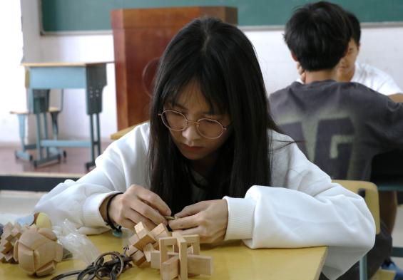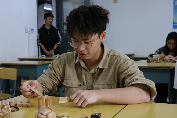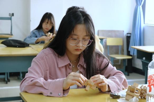比赛开始,选手们全神贯注地对鲁班锁进行拆拼装,体现了土建学子敢于挑战自我,勇于尝试的拼博精神。