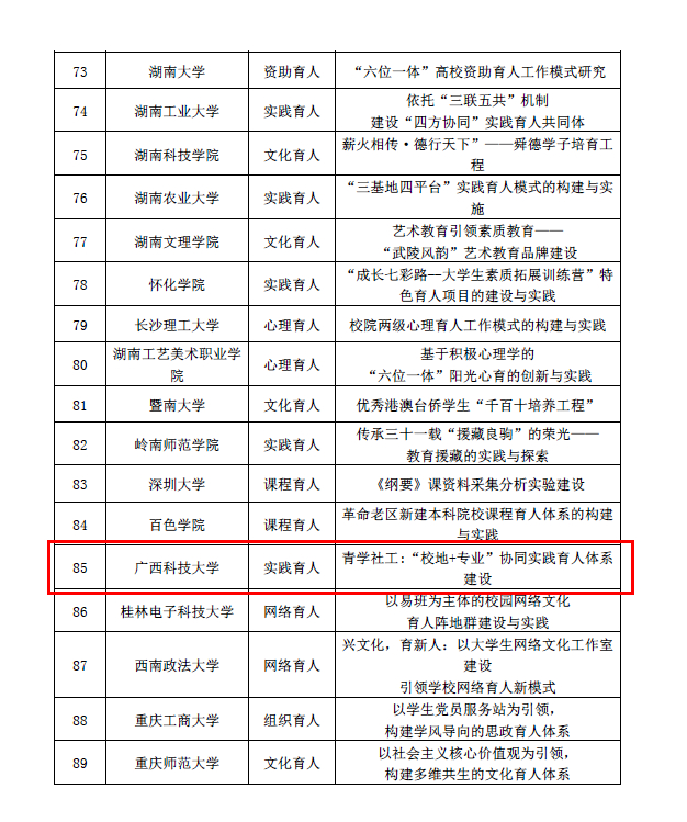 据悉,根据《教育部思想政治工作司关于培育建设高校思想政治工作精品项目的通知》要求,此次精品项目分两批评选,广西共4个项目入选第一批、第二批高校思想政治工作精品项目。高校思想政治工作精品项目主要分为课程育人、科研育人、实践育人、文化育人、网络育人、心理育人、管理育人、服务育人、资助育人、组织育人等类型。