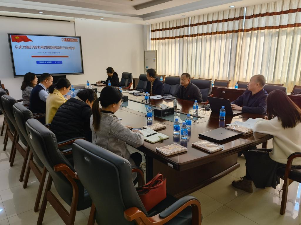 12月2日,团委理论学习中心组在东环校区行政楼5-1会议室进行2021年第九次集体学习,专题学习中国共产党第十九届中央委员会第六次全体会议精神,团委理论学习中心组全体成员参加会议,会议由马克思主义学院院长黄山松主讲,校团委书记朱广生主持。