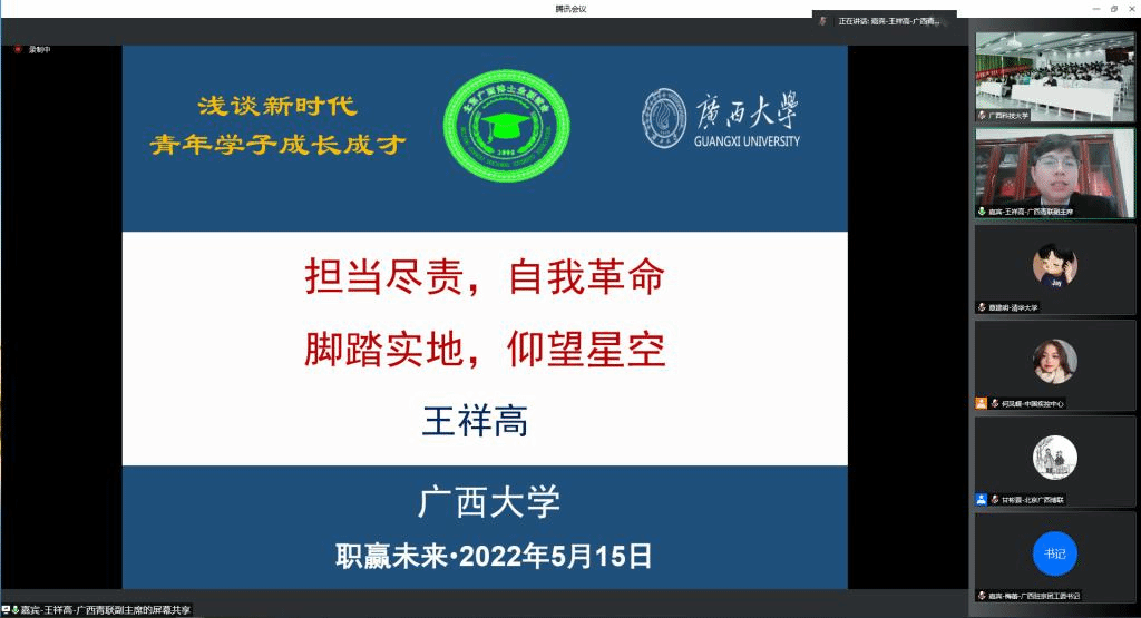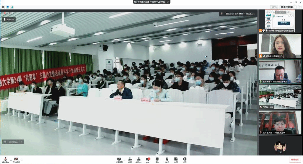 会后,文家燕进行总结发言,他指出,学校团委高度重视青年学子的成长成才,此次主题沙龙让京桂学子相聚云端,希望广西科大学子能够接续青年榜样力量,给大家带来更多的帮助和思考。与会同学也表示,此次活动拓宽了视野,收获颇多。活动在热烈的气氛中圆满落下帷幕。