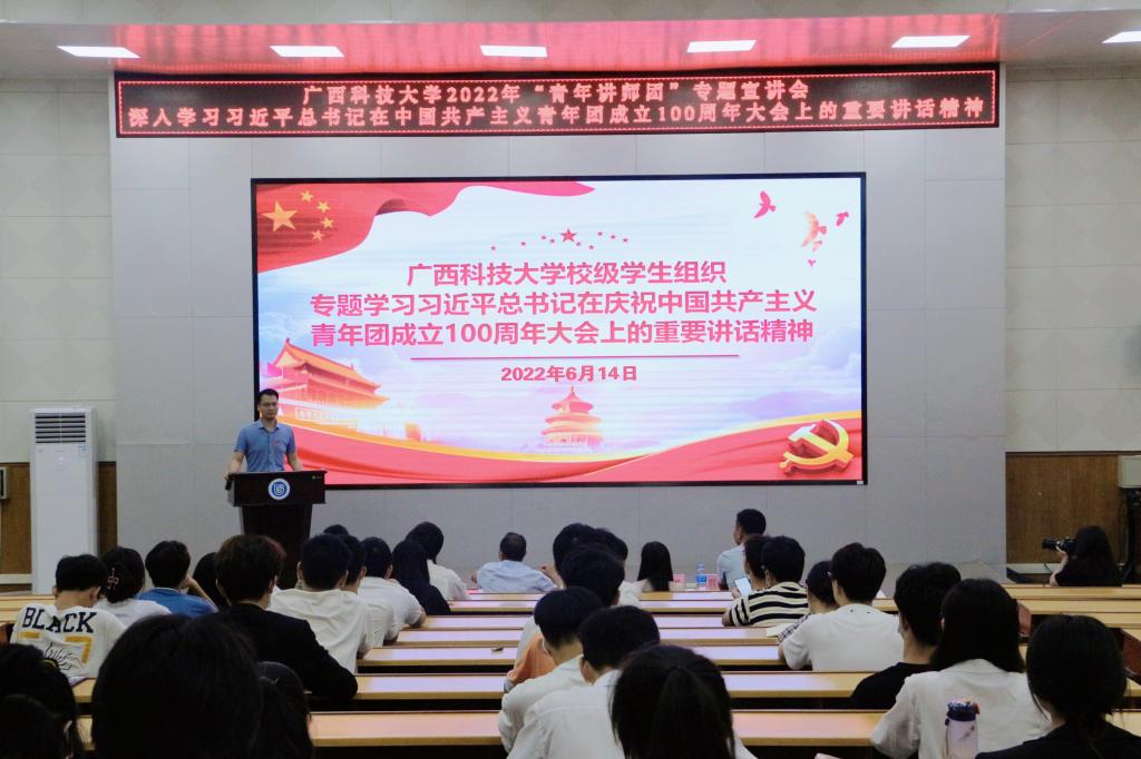 为进一步加强我校学生组织的政治理论学习与思想教育建设,6月14日下午,学校“青年讲师团”成员朱广生专题宣讲会学习习近平总书记在庆祝中国共产主义青年团成立100周年大会上的重要讲话精神。校团委全体成员、马克思主义学院团委书记何向以及新一届校级各组织部副部长及以上学生骨干参加现场宣讲会,宣讲会在东环校区图书馆报告厅召开。