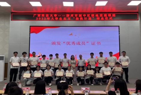 8月13日上午,广西科技大学与柳州市城中区校地党建联建之大学生实习“扬帆计划”结业仪式在学校文昌校区图书馆报告厅举行。柳州市城中区团委书记蓝佳鑫及城中区相关实习单位负责同志,学校团委副书记文家燕,团委社会实践部、各二级学院(部)团委书记及我校参加2022年大学生实习“杨帆计划”的全体同学一同参加结业仪式。