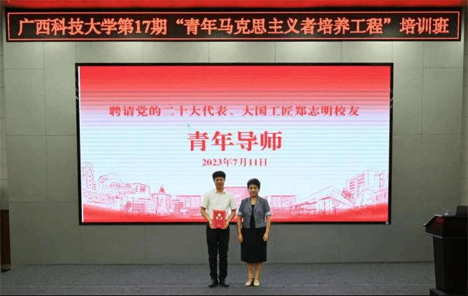 党的二十大代表、大国工匠郑志明校友怀着对母校的“爱校荣校”之情回校为“青马班”学员授课。在授课之前,校党委副书记覃萍为郑志明校友颁发“青年导师”聘书,并与学生骨干开展“习近平总书记与大学生在一起”学习分享活动。郑志明带领同学们一起回顾了他从学徒成长为大国工匠的成长之路,还重点结合自己参加中国共产党第二十次全国代表大会的亲身经历,以参会者的独特视角带领同学们纵深学习了党的二十大精神。郑志明校友的授课展现了广西科大学子积极向上、拼搏奋斗的精神风貌,他以强烈的爱校之情感染在校学生,激发同学们的爱校荣校热情。