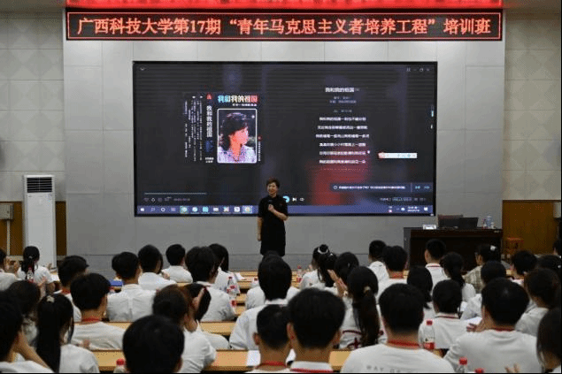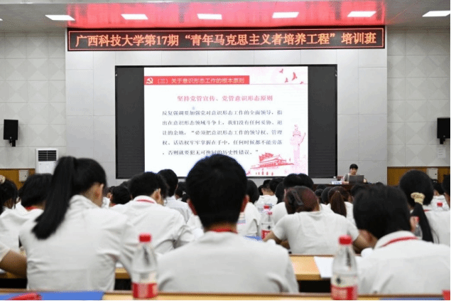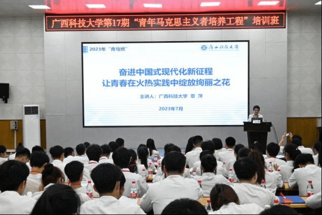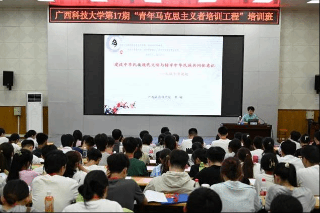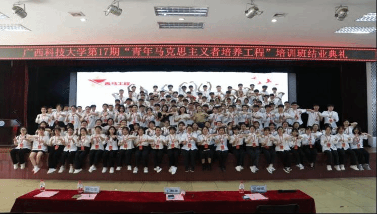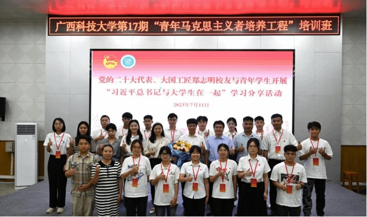 7月14日下午,第17期“青年马克思主义者培养工程”培训班在文昌校区大学生活动中心举行结业典礼,全体学员共同开展了一场“习近平总书记与大学生在一起”学习分享活动。他们或用自己的歌声,以青春的风貌传唱自己对国家的热爱、对党的信仰,或用自己的故事,以真挚的感情讲述习近平总书记领航定向、指引青年成长成才的动人故事,充分展现了新时代广西科大学子在习近平总书记的殷切期望中奋勇向前、姿态昂扬的精神风貌。