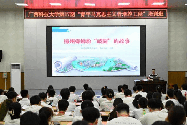 柳州日报社总编辑、高级记者李斌校友以螺蛳粉的发展为主线,通过引入“网红”小故事,带领学员们探索了螺蛳粉的起源,讲解了柳州作为工业城市却以美食“破圈”的历程,向同学们全方位展示了柳州当前的形象名片——螺蛳粉,给大家带来了一场“有味道”的讲座。同时作为我校优秀校友的他还结合自身的学习和工作经历讲述了自己的逐梦过程,鼓励学弟学妹们忠于热爱,不懈追求,以自己的方式焕发爱校热情,点亮荣校之光。