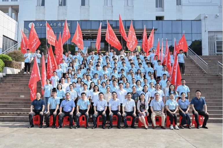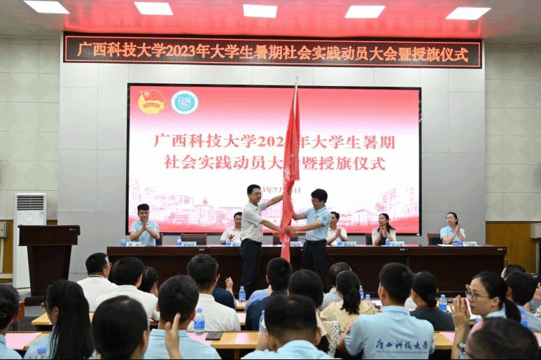 仪式最后,参会领导分别为集中开展暑期社会实践的团队授旗。据悉,今年暑期社会实践活动项目共组建了55支团队537名师生将围绕理论普及宣讲、促进乡村振兴、观察发展成就、党史学习教育、促进民族团结、考察边境发展、中外大学生实践和专项活动等8个方面开展形式多样的社会实践活动,以实际行动助力乡村振兴和社会发展。