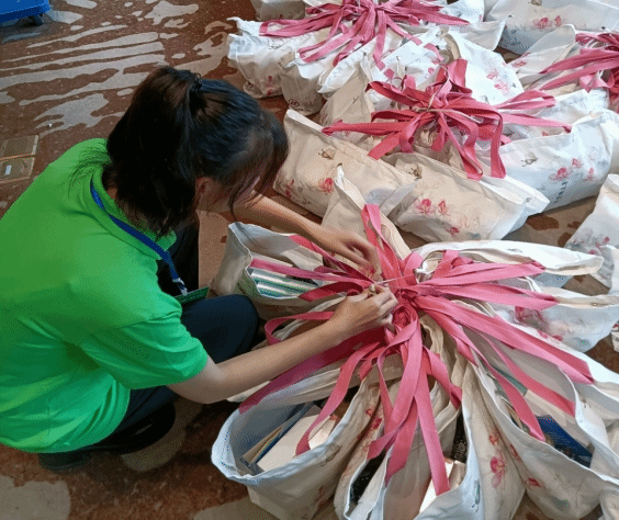 志愿者在准备嘉宾物品袋