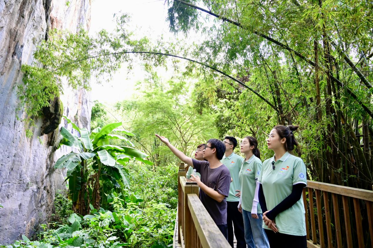 广西科技大学“00后话百年”宣讲服务队成员与花山岩画文化景观讲解员开展“交互式”宣讲