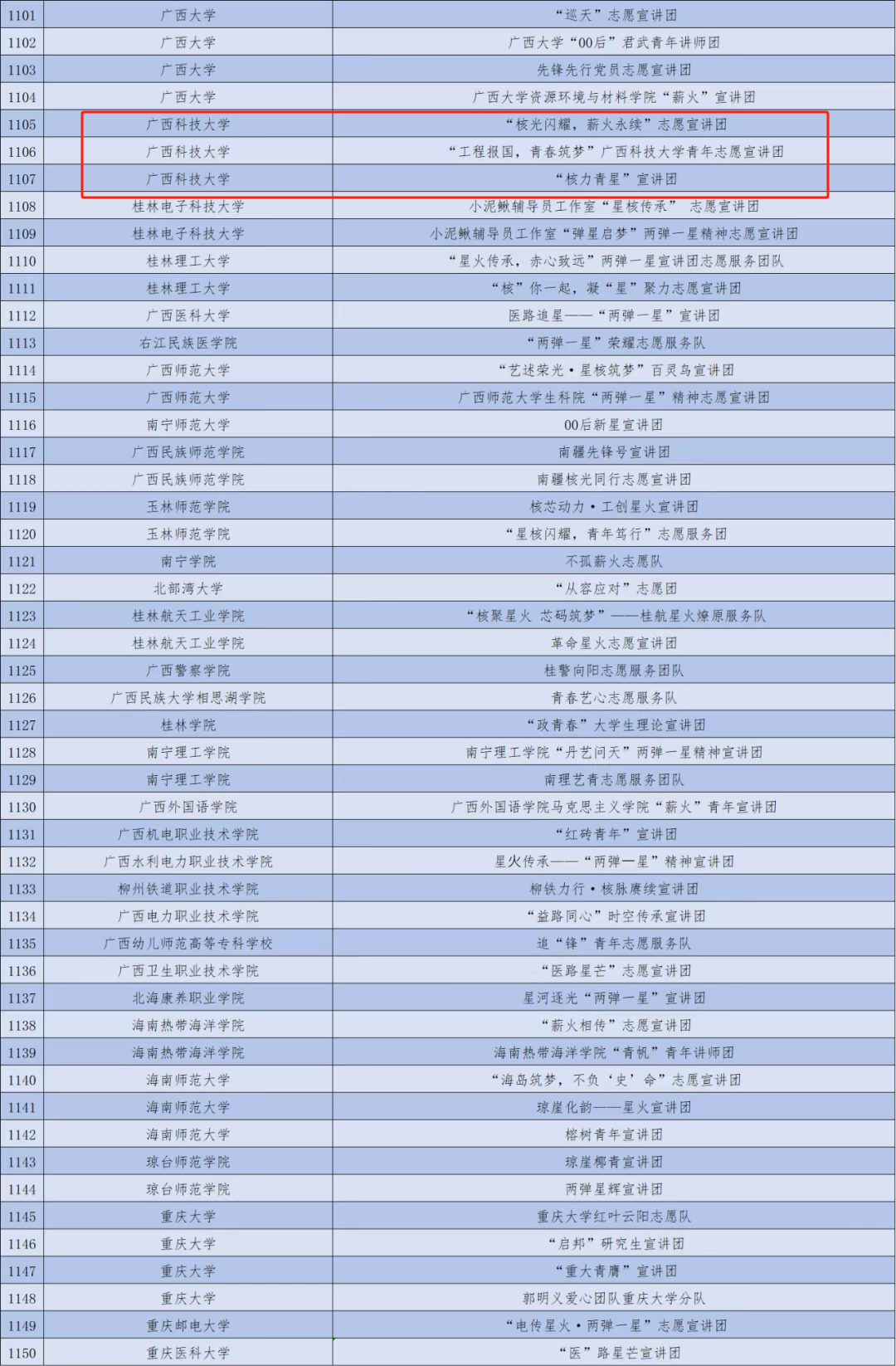 在强国伟业呼唤青春担当的时代号角声中,我校青年志愿服务工作再传捷报!共青团中央青年志愿者行动指导中心与中国核工业集团有限公司联合开展的2025年全国大学生“两弹一星”精神志愿宣讲团遴选结果日前揭晓。经过激烈角逐与严格评审,我校三支青年志愿服务团队从全国1123所高校的5680支申报团队中脱颖而出,成功入选“两弹一星”精神志愿宣讲团。同时,我校被光荣遴选为全国16所“两弹一星”精神志愿宣讲重点联系高校之一,成为肩负更高使命的宣讲先锋。