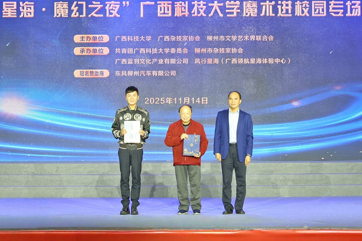 11月14日,由我校和广西杂协、柳州文联共同主办的幻彩广西科大 魔幻华章启航——“风行星海·魔幻之夜”魔术进校园专场演出在文昌校区大礼堂精彩上演,学校党委书记赵君等全体在家校领导、中国杂技家协会副主席邓宝金等各级杂协领导、柳州市相关领导,及近2万观众线上线下观看演出。