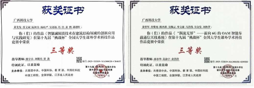 近日,第十九届“挑战杯”全国大学生课外学术科技作品竞赛获奖名单公布。我校学子凭借出色的创新能力和扎实的专业素养,在激烈竞争中脱颖而出,荣获全国三等奖2项,充分展现了我校青年学子锐意进取、勇于挑战的精神风貌。