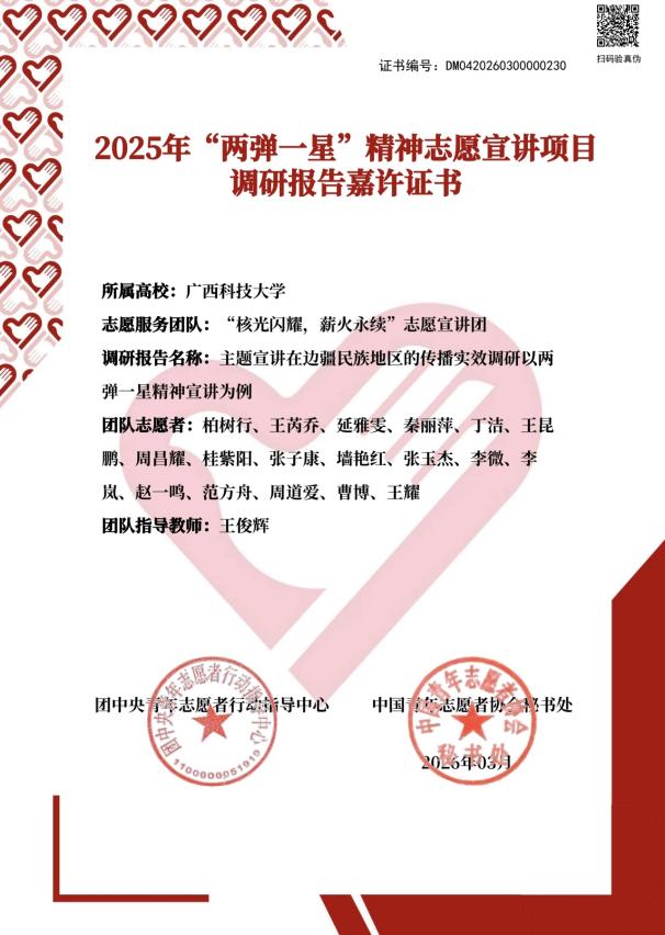 从案头深耕到田间宣讲,从深夜打磨到边疆开讲,广西科大青年学子用青春实干诠释了新时代大学生的责任与担当。未来,学校将继续引领广大青年以“两弹一星”元勋为榜样,将个人理想融入民族复兴伟业,在科技自立自强的征程中勇担使命,为强国建设贡献青春力量。