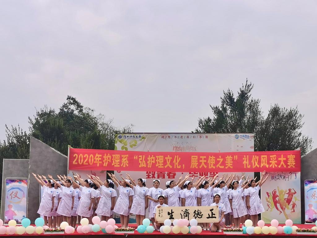 11月1日下午15:00分,广西科技大学医学部护理系“弘护理文化·展天使之美”礼仪风采大赛在柳石校区音乐广场举行。本次比赛由护理系党总支副书记李艳霞,护理系团总支书记黄婷婷,护理系辅导员张雪萍担任评委,并邀请了护理系班主任到场观看。共同观看本次大赛的还有医学部护理系的1000名观众。
