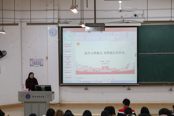 王湘林以“提升七种能力,发挥领头羊作用”为主讲内容,分别从“什么是领头羊”、“如何清晰认识领头羊的角色”、“提升七种能力,发挥领头羊作用”三个方面展开阐述。王湘林结合当下国内时事政治、抗疫形势,列举大量丰富生动的事例,生动形象地诠释了学生骨干应具备的七种能力:政治能力、调查研究能力、科学决策能力、改革攻坚能力、应急处突能力、群众工作能力、抓落实能力。