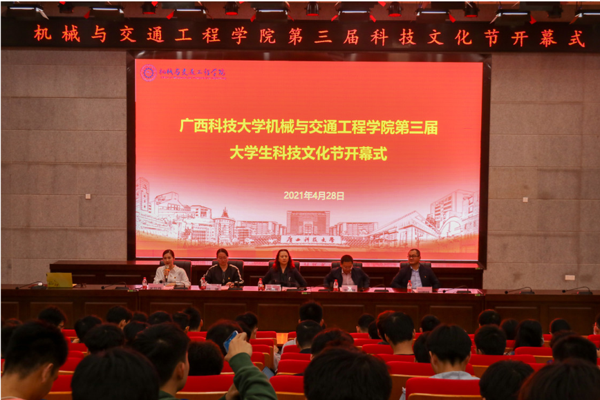 为了庆祝中国共产党建党100周年,进一步培养和提高大学生科技创新意识,营造积极向上的校园文化氛围,4月28日,机械交通学院第三届大学生科技文化节在柳东校区T1-303多功能报告厅隆重开幕。学院党委书记卢丽虹、院长李健、党委副书记何敏和党委副书记刘湘桂及350余名师生参加开幕式。开幕式由学院团委书记关敏丹主持。