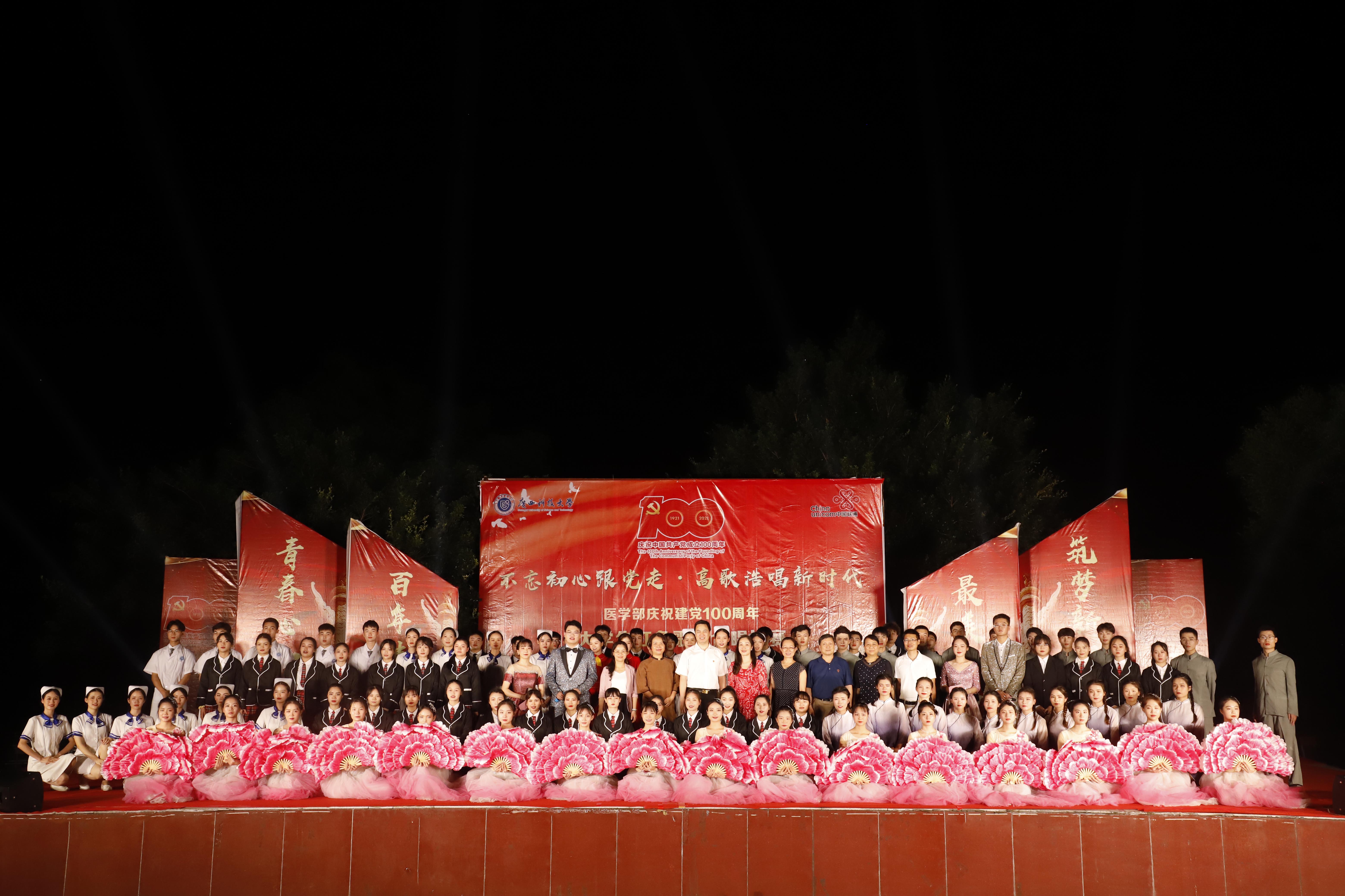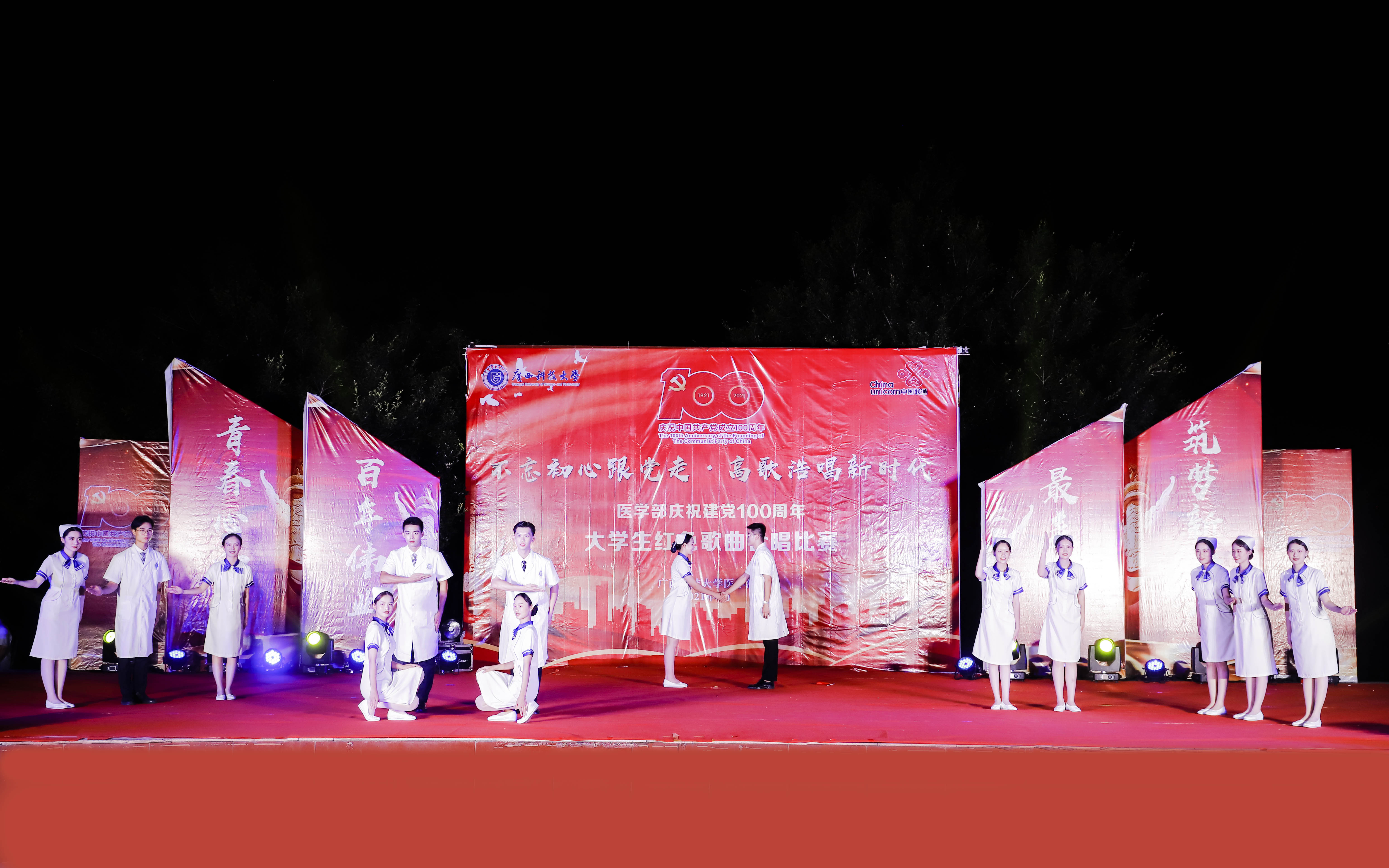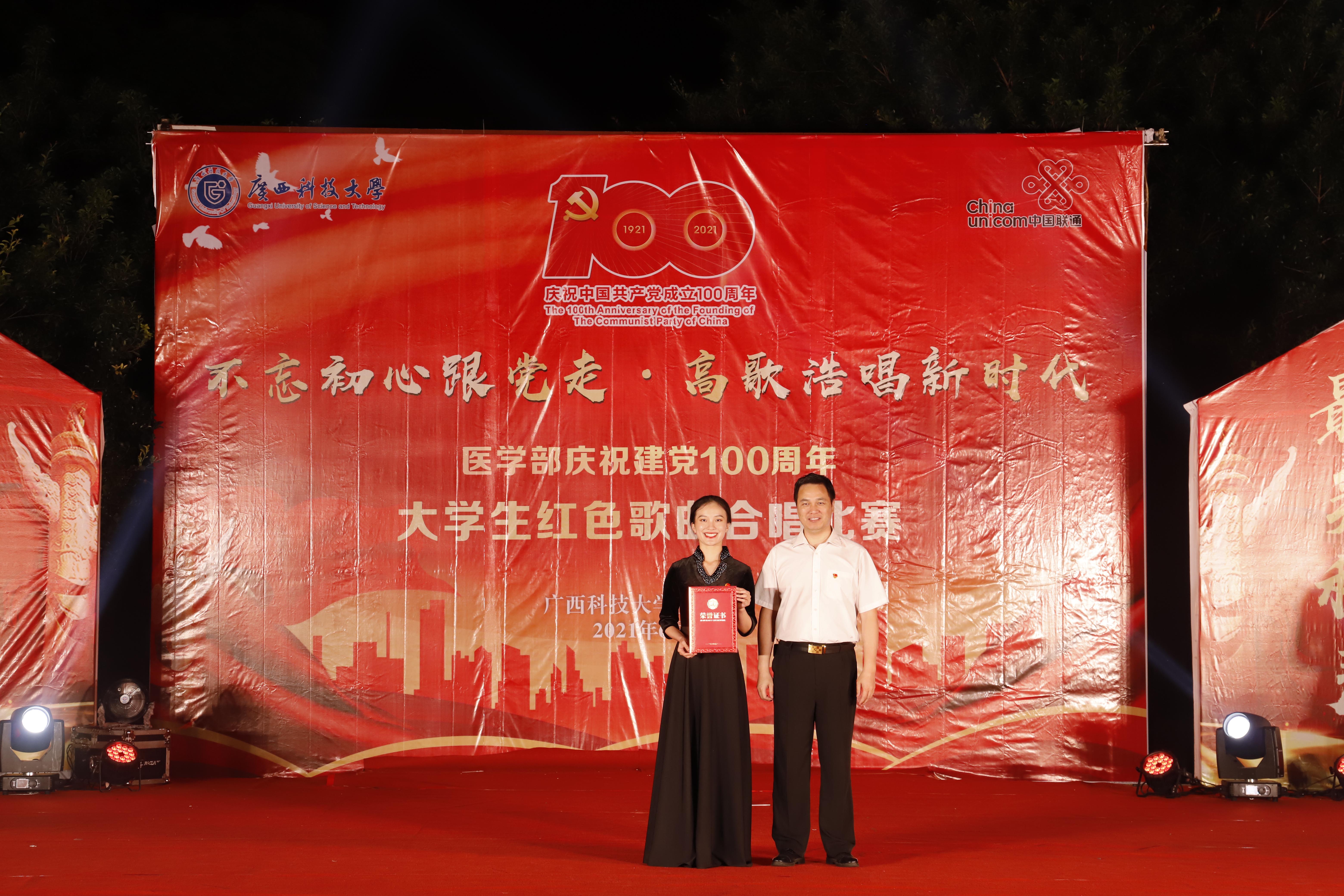 为弘扬时代主旋律,传承红色革命精神,向中国共产党成立100周年献礼,6月6日晚7时,医学部在柳石校区音乐广场举行了“不忘初心跟党走·高歌浩唱新时代”庆祝建党100周年大学生红色歌曲合唱比赛,学部党委常务副书记、纪委书记谭铁军,学部党委副书记刘莉莉,学部党政办主任梁贞巧,学部教学办主任徐兆学,学部学工办主任、团委书记何曲波,第一临床医学院党委副书记陈恒,第二临床医学院党委副书记邓燕,护理系党总支书记秦子平等出席了比赛,公共卫生系主任陆春,护理系党总支副书记李艳霞,学部人文艺术教研室主任李真真,学部大学生艺术团声乐队指导教师郭融融,第一临床医学院团委委员李凡,护理系辅导员梁静担任本次比赛的评委,学部各院系师生共计1200余人到场参加。