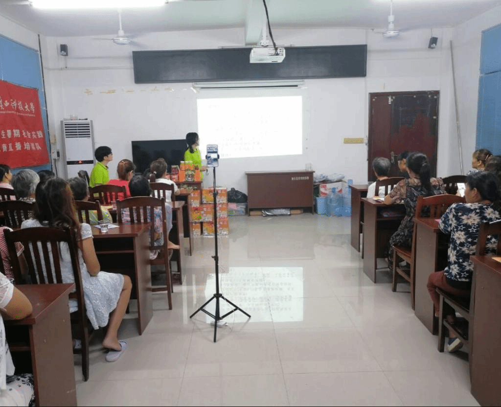 第一期培训的内容,主要围绕电商直播基本信息,短视频的设置、拍摄展开。课后,几个村民还围着主讲的同学不断地提问,大家被村民认真的态度所打动。第二期培训的主要内容为电商直播的实操,并讲授短视频的作用以及如何通过短视频获取流量。最后一期培训,围绕电商直播的趋势和直播前的一些准备工作(如设备、灯光、支架、以及拍图上链接等)进行。最后几个小主播为大家演示了模拟直播带货过程,村民们看的起劲,听的津津有味。一位村民说,不学习就跟不上社会要求了,你们讲的特别好,刚好解决了我的疑惑。