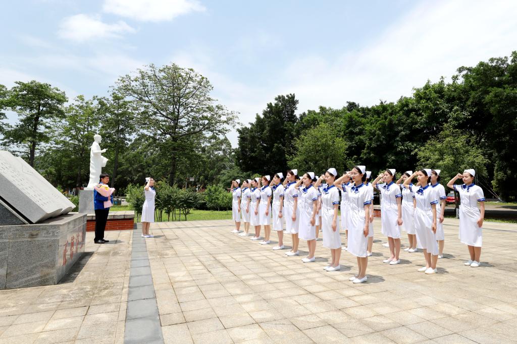 报告会当天,正值第112个国际护士节,我校护理学专业学生邀请郑志明代表参加和见证她们的宣誓仪式。郑志明代表来到她们的中间,与护理学子共同庆祝国际护士节,并勉励青年学子们坚定不移跟党走,明确人生发展方向,扎扎实实努力学好专业技术,培育和传承劳动精神、劳模精神、工匠精神,努力用专业技术回报父母、回报社会、回报祖国。