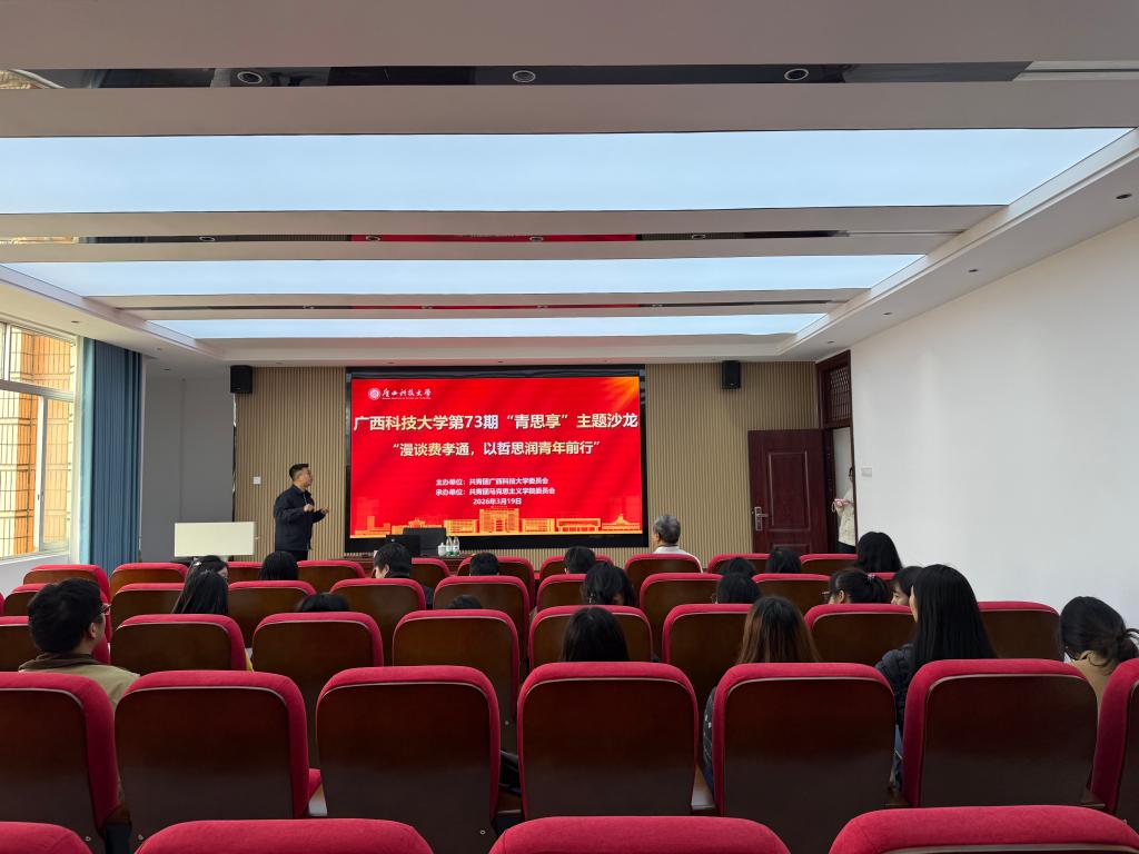 2026年3月19日下午,由马克思主义学院承办的广西科技大学第73期“青思享”主题沙龙在建工楼502室举行。特邀陈建新教授作题为《漫谈费孝通——我为什么要积极宣讲费孝通?》的专题讲座。讲座由马克思主义学院副院长张磊主持,全体研究生到场参会。