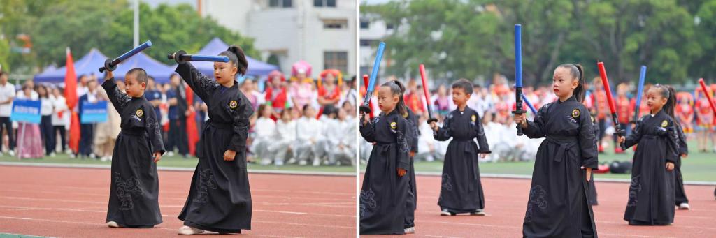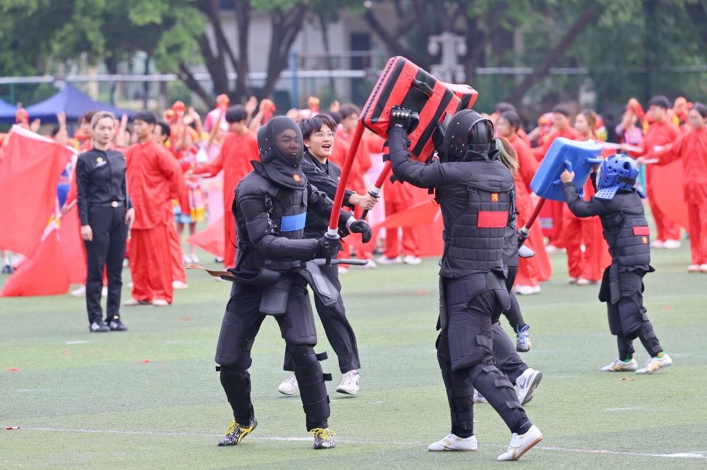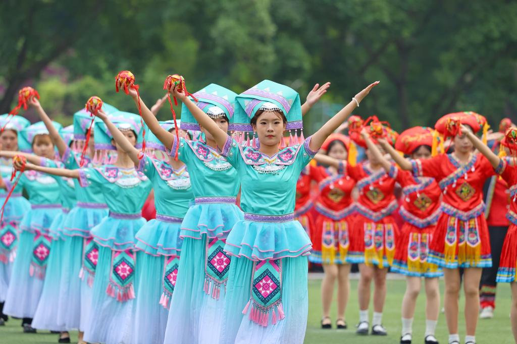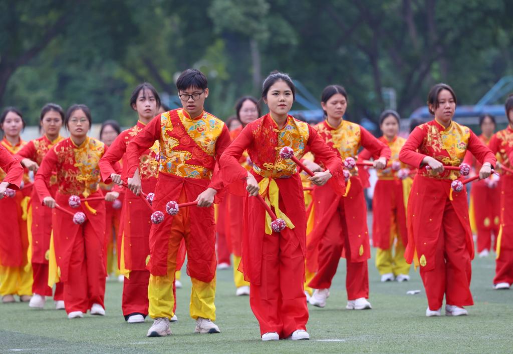 在公共体育、美育教学成果展演环节中,千名学子进行了绣球排舞、八段锦、武术、啦啦操、健身操、民族舞蹈、书法等的展示,通过传统与现代交织、力量与柔美碰撞,展现了广西科大学子在体育与美育浸润中焕发的蓬勃朝气与昂扬风貌。