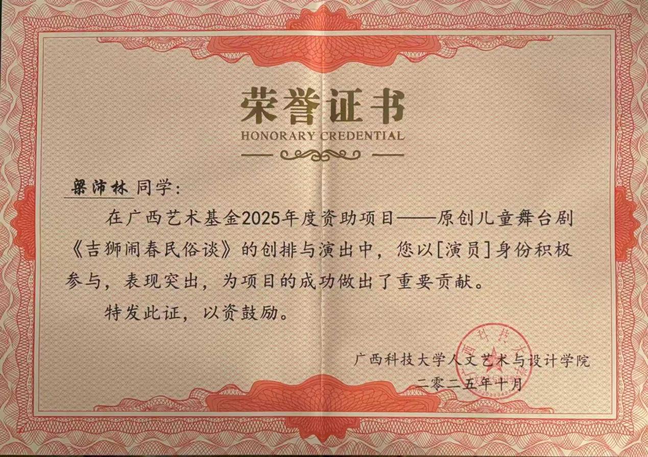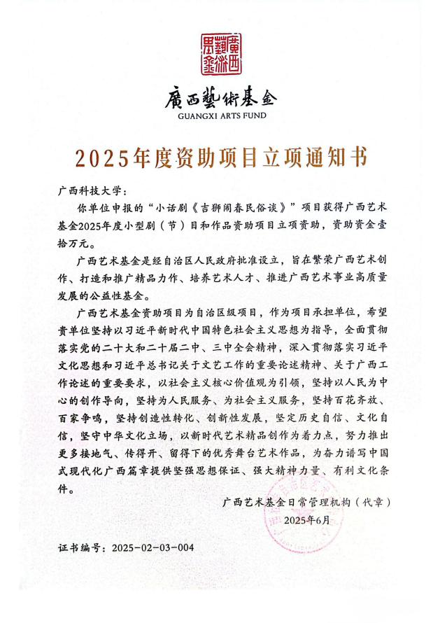 舞狮队致力于深化文化服务,于2025年8月获邀参与广西艺术基金2025年度资助项目——《吉狮闹春民俗谈》小型剧目的创作与排练。舞狮队成员与专业艺术团队协作,将传统舞狮技艺与现代舞台艺术相融合,经由创新编排、服装设计及叙事表达,为民俗节目注入新时代内涵。该剧目于广西科技大学校园首演后,获得业内专家及观众的高度赞誉。