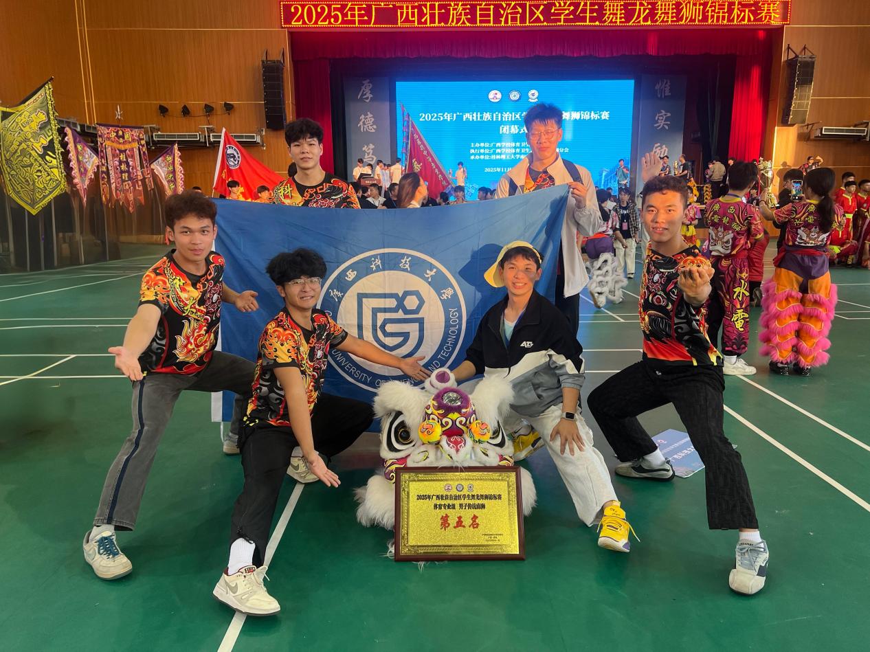 在服务校园与社会的同时,舞狮队秉持“以赛促学、以赛促练”的理念,在学科竞赛领域初露头角。今年11月,舞狮队参加了2025年广西壮族自治区学生舞龙舞狮锦标赛,凭借“醒狮过桥饮佳酿”主题表演,荣获体育专业组男子传统男狮第五名。队员们结合运动力学与民俗美学,反复雕琢技术细节,充分展现了传统体育与非遗文化的深度融合。