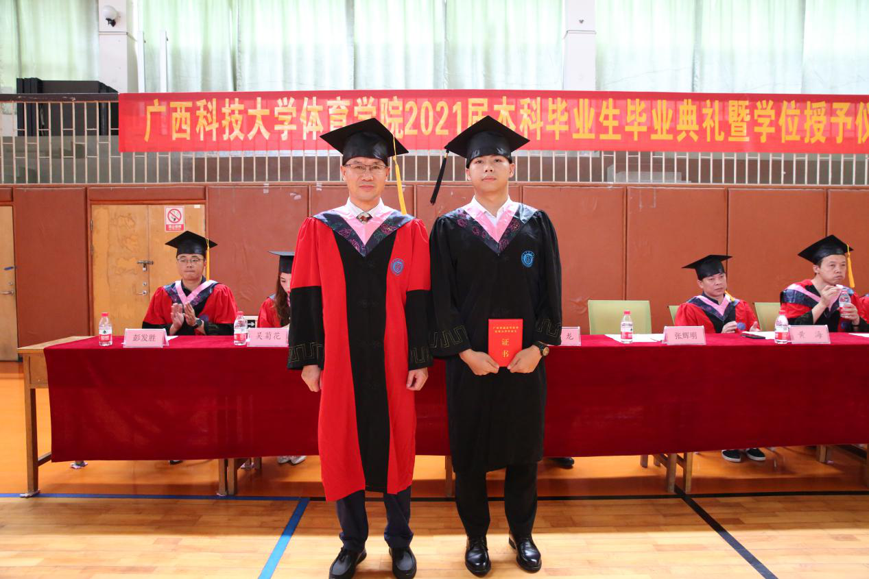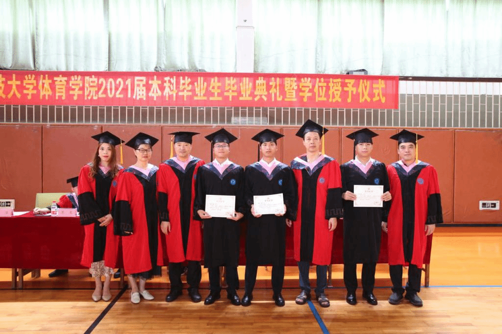 毕业典礼在庄严的国歌声中拉开帷幕。体育学院副院长王萍宣读有关表彰决定,体育学院副院长苏龙宣布《关于公布普通本科2021年6月毕业、结业、肄业学生名单的通知》科大发〔2021〕74 号,体育学院副院长黄海颁发校友联络员聘书。体育学院学位评定委员会主席、体育学院党委书记张辉明、党委副书记彭发胜、副院长苏龙、黄海和王萍为毕业生拨穗,颁发毕业卷轴并合影留念。