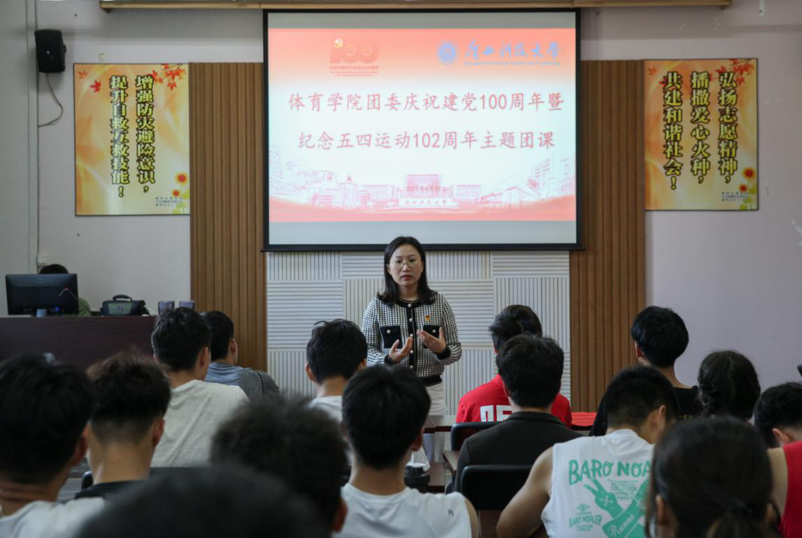 为庆祝中国共产党建党100周年,引导激励广大团员青年弘扬“爱国、进步、民主、科学”的五四精神,学党史、强信念、跟党走,让红色基因、革命薪火代代传承,以优异成绩迎接建党100周年。4月29日下午,体育学院团委在一楼会议室开展庆祝建党100周年暨纪念五四运动102周年主题团课。