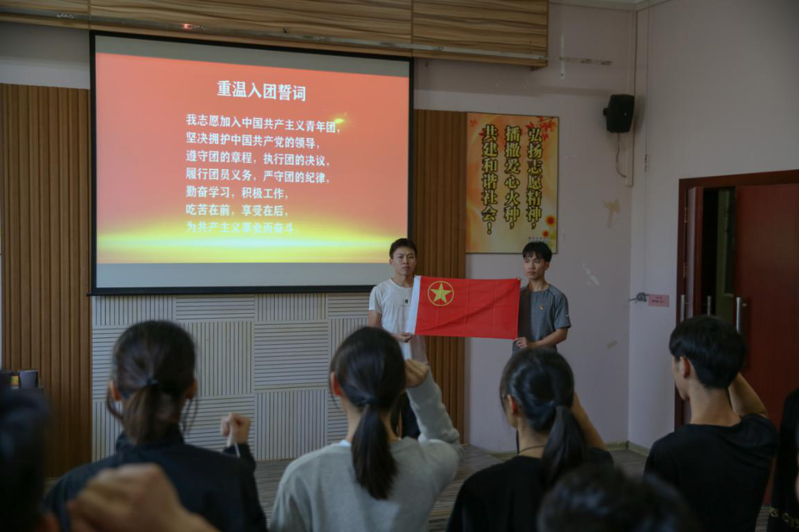 随后,同学们观看了《五四历史》视频,一幕幕激昂的画面在屏幕上呈现,激起了同学们的铿锵热血。随后,新团员举行入团仪式,全体团员重温入团誓词,牢记作为一名共青团员的使命与责任。最后,全体肃立,奏唱“光荣啊,中国共青团”。团课在激扬的团歌中结束。