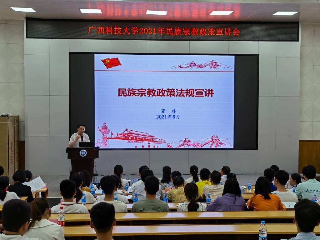 5月15日,学校党委统战部分别在东环校区和柳东校区举办了民族宗教政策法规宣讲会,党委统战部部长麦林作宣讲报告,各二级学院团委书记、学生干部、学生党员300余人聆听了报告。