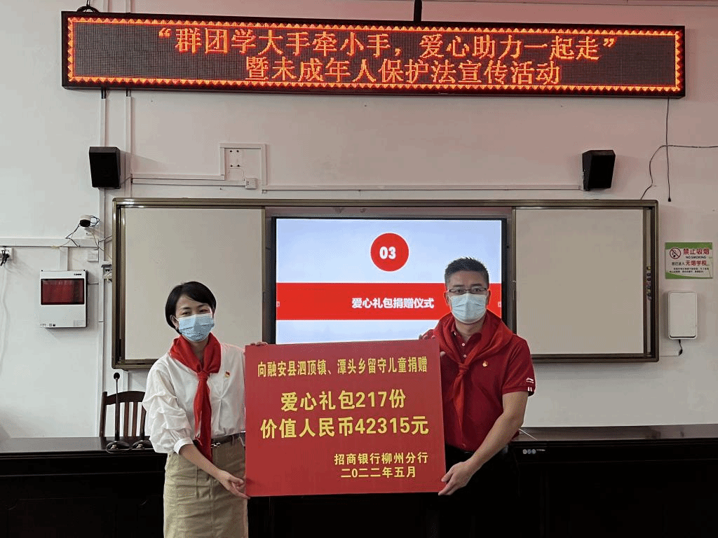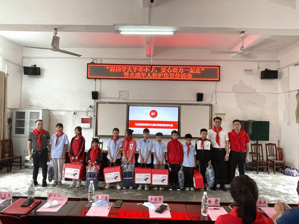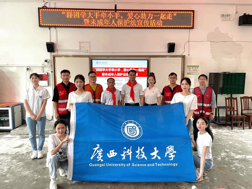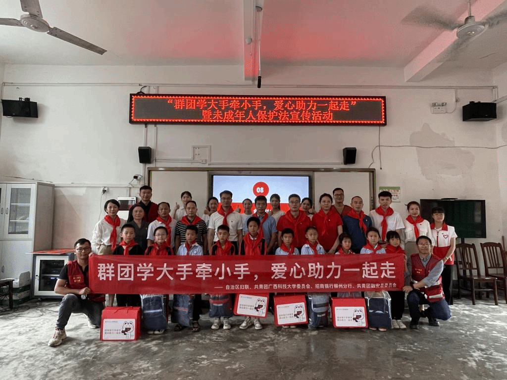 为响应国家乡村振兴战略,巩固脱贫攻坚,助力乡村教育事业发展,5月30日,学校团委联合自治区妇联、招商银行柳州分行、共青团融安县委员会、柳州市妇女联合会、柳州市中级人民法院、融安县泗顶镇党委政府等单位共同开展了“群团学大手牵小手,爱心助力一起走”暨未成年人保护法宣传活动。