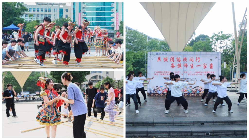 4月18日,学校在文昌校区宗元广场举办第五届“广西三月三”校园民族文化教育活动,欢度广西“广西三月三”传统节日。本届“广西三月三”校园民族文化教育活动以“民族团结我同行 各族师生一家亲”为主题,由学校党委统战部、团委联合主办,体育学院承办。