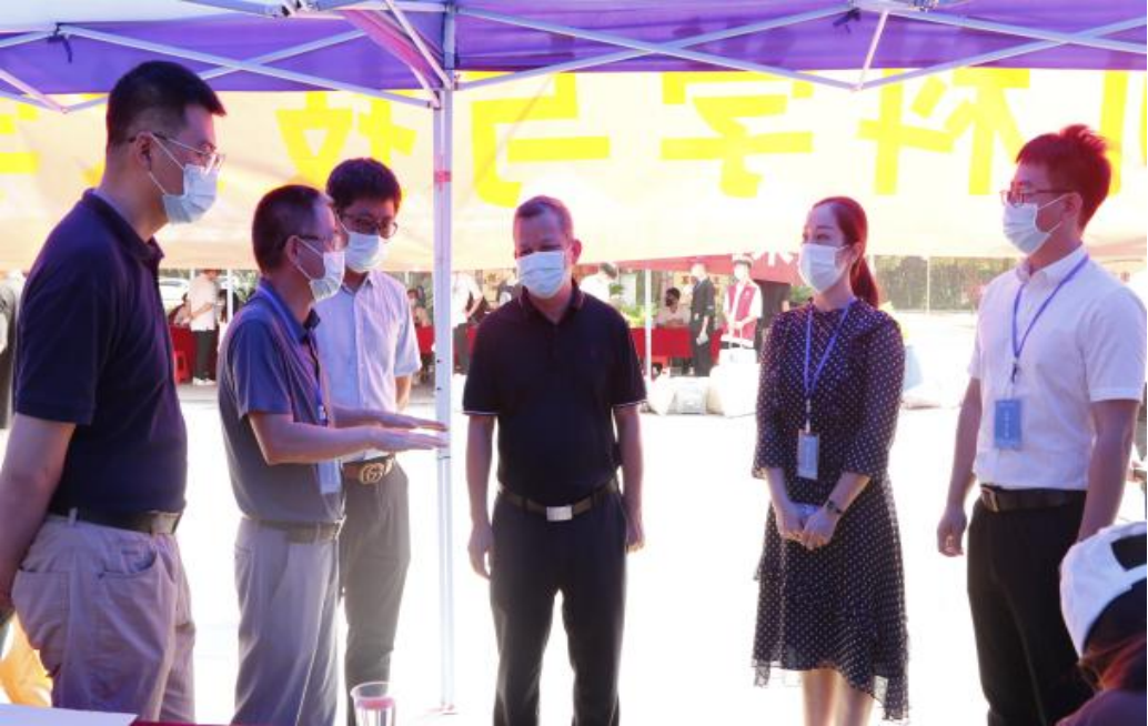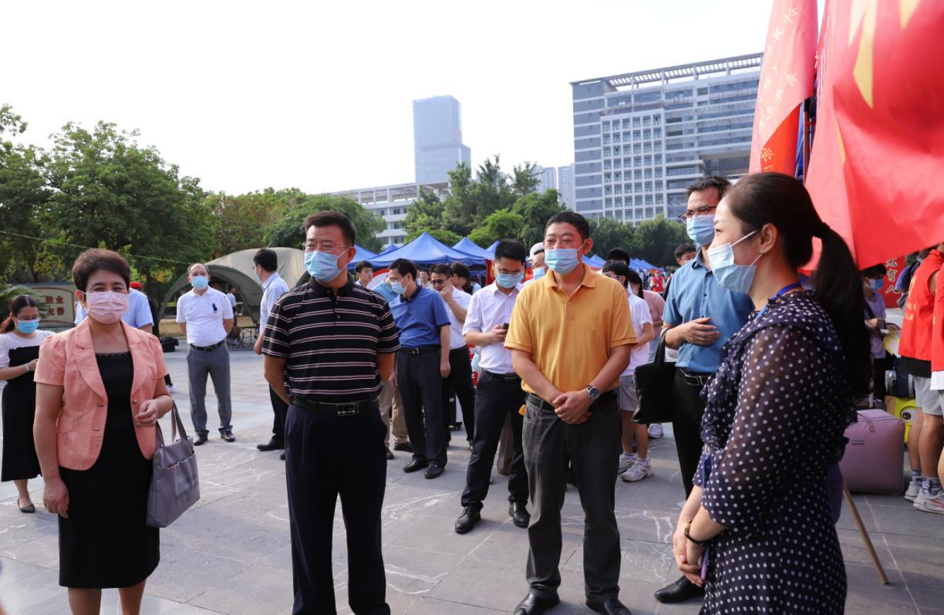 学校党委书记赵君(左2)学校党委副书记、校长刘宝臣(左3)学校党委副书记覃萍(左1)到学院迎新现场看望师生并指导工作