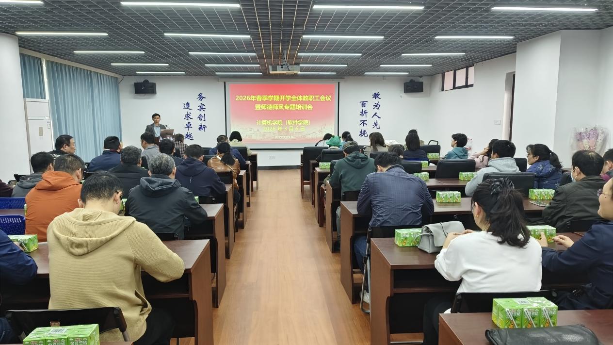 3月6日下午,计算机学院(软件学院)在科教楼507室召开2026年春季学期开学教职工会议暨师德师风专题培训会。会议开展了政治理论学习、《新时代高校教师职业行为十项准则》及师德师风相关要求、意识形态和安全稳定工作教育以及民族宗教政策法规学习等,全体教职签订了师德师风承诺书。会议还就新学期相关工作进行了安排部署。
