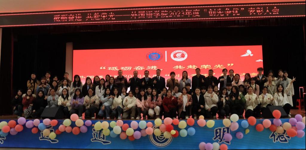 继往开来砥砺奋进,踔厉奋发共赴荣光。为表彰先进、树立典型,以昂扬的姿态和奋进的脚步迎接新年的到来,展现我院师生热情、积极向上的精神风貌,激励广大师生以更饱满的热情、更昂扬的斗志、更充足的干劲推动学院各项工作高质量发展,1月7日上午,外国语学院在文昌校区大学生活动中心隆重举行2023年度师生“创先争优”表彰大会。学院党政领导班子成员、全体教职工以及受表彰的先进个人、学生代表共400余人参加大会。