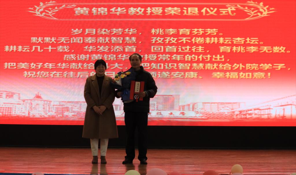 接下来是黄锦华教授荣退仪式,周柳琴院长代表学院为黄锦华教授献花并送上纪念册,纪念册上是学院全体教职工对黄教授的祝福,祝福黄教授荣退后的生活如鲜花般美丽芬芳,绚丽多姿。黄教授表示对学院有着深厚的感情,到了退休的时刻,感到非常不舍,学院凝聚了每一位外院人的心血和努力,现今学院正不断壮大发展,未来将乘着新时代的好风展翅高飞。希望学院青年教师深耕教学科研,潜心立德树人,为外国语学院发展贡献智慧和力量。
