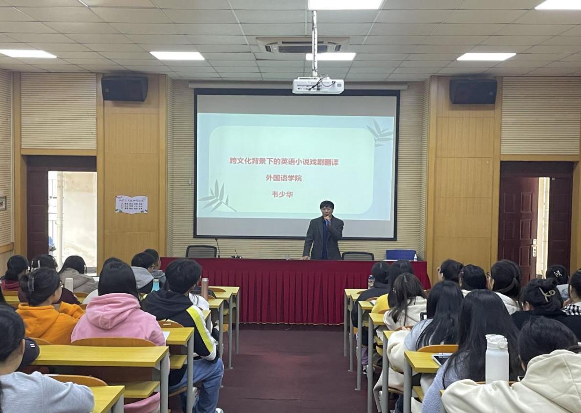 2023年11月14日下午,外国语学院第九期“译语讲堂”学术讲座在基础实验楼102教室顺利举行。外语学院硕士生导师韦少华副教授给2023级翻译专业硕士研究生做了题为“跨文化背景下英美小说、戏剧翻译”的讲座,讲座由外语学院副院长金钱伟主持。英语专业本科生也到场旁听了讲座。