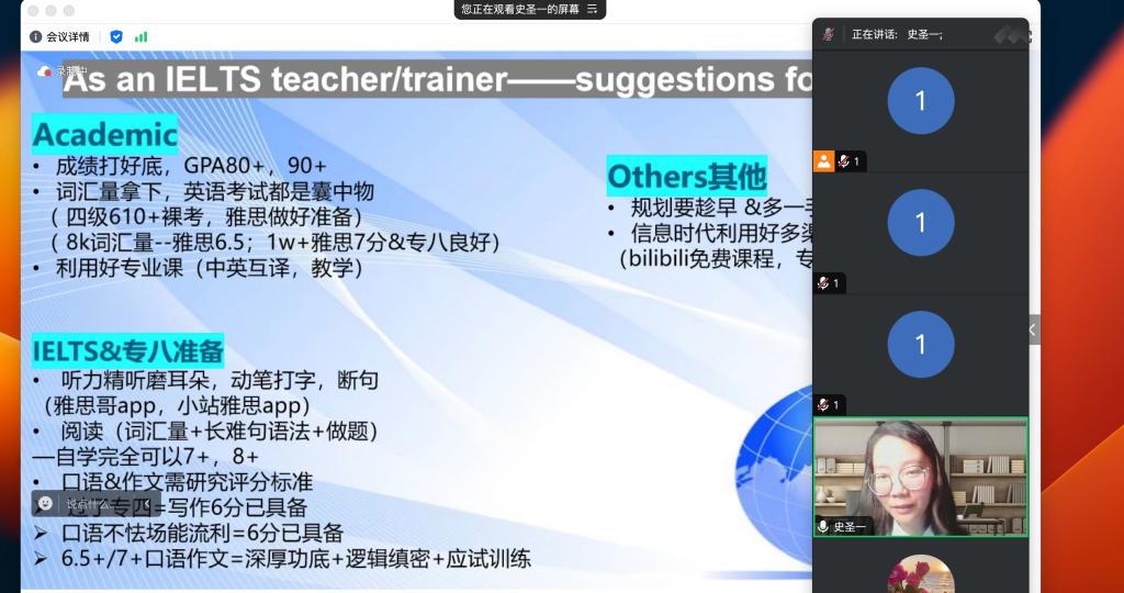 史圣一首先对自己的校园生活做了简要介绍,与同学们畅聊课程学习、兼职实践等经历,并结合专业特色与个人多年从业经验,对雅思备考、得分点等具体情况进行分析。随后结合学校就业质量报告与在场同学分析国内外升学的严峻形势,详细解读国外热门国家留学概况,鼓励同学们结合自身实际情况,在就业、国内考研、国外升学等多种方向中选择最适合自己的道路。