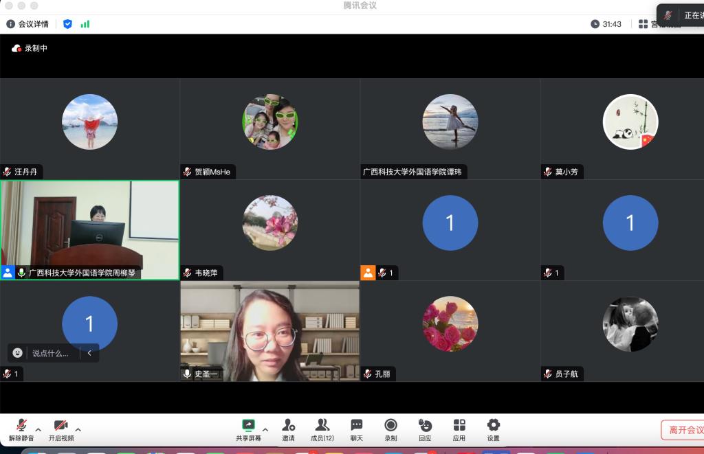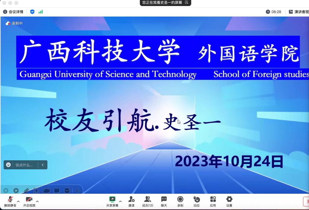 10月23日晚,外国语学院举办第二期校友引航交流会。交流会以线上线下结合方式进行。学院2009级优秀校友史圣一在北京以视频方式作交流。学院院长周柳琴,辅导员梁艺静以及2020-2023级学生在文昌校区基础实验楼106教室参加交流会。交流会由周柳琴主持。