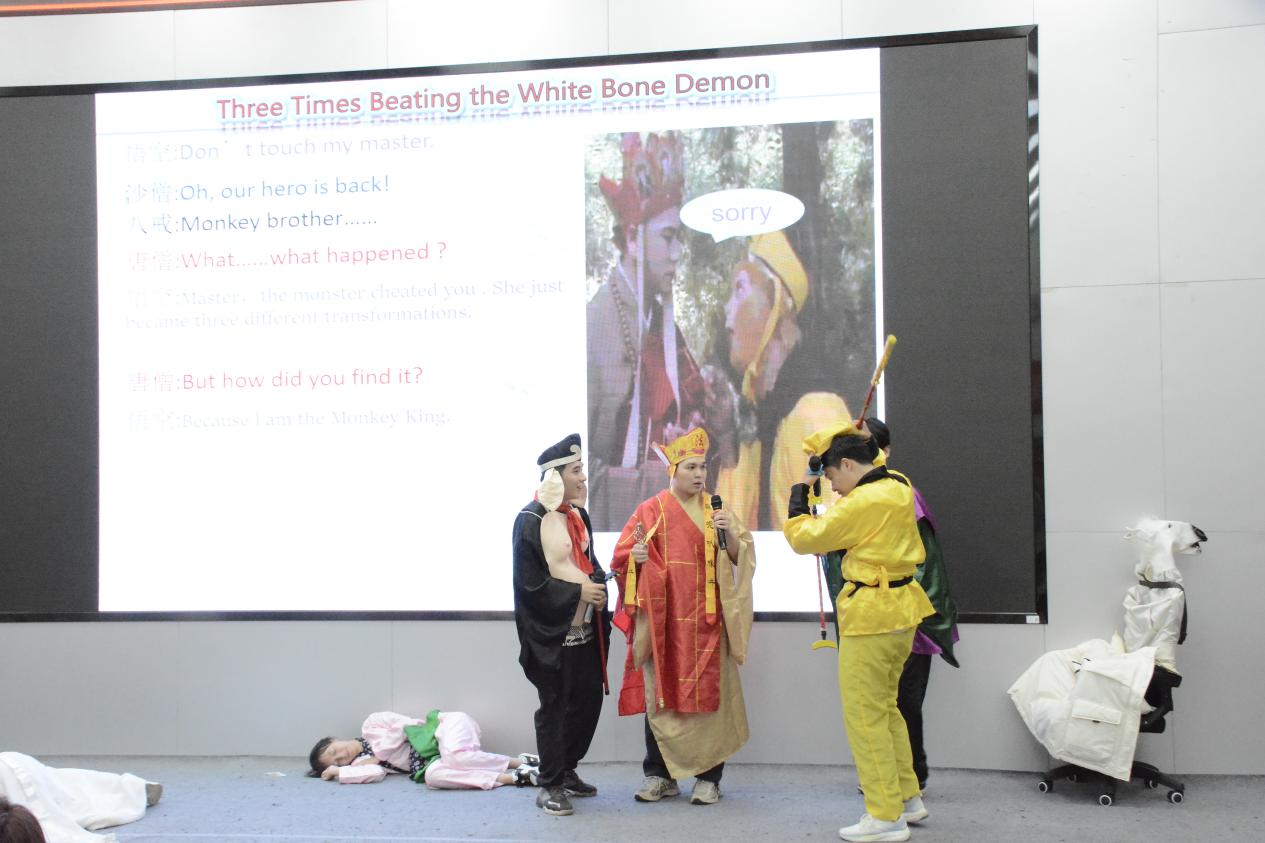 来自学校10个学院(部)的各代表队依次上台表演。从精美的道具到热情饱满的演员,从华丽的服饰到标准流畅的英文发音,参赛选手们为现场观众呈现了《茶馆》《三打白骨精》《新白蛇传》《花木兰》等多部中国文化经典片段。