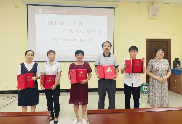 周柳琴为学院周桂香、黄锦华、韦巧燕、韦少华、刘彦臻等5位从教三十周年以上的教师颁发荣誉证书并赠送纪念品。