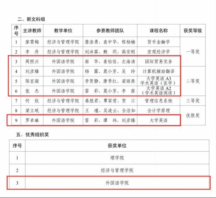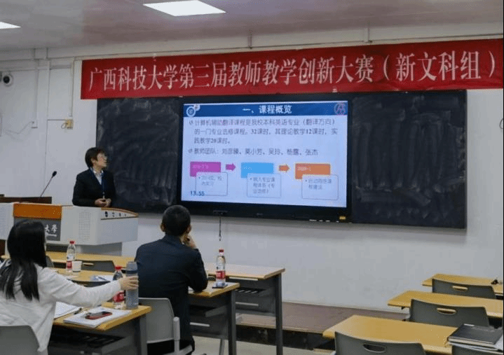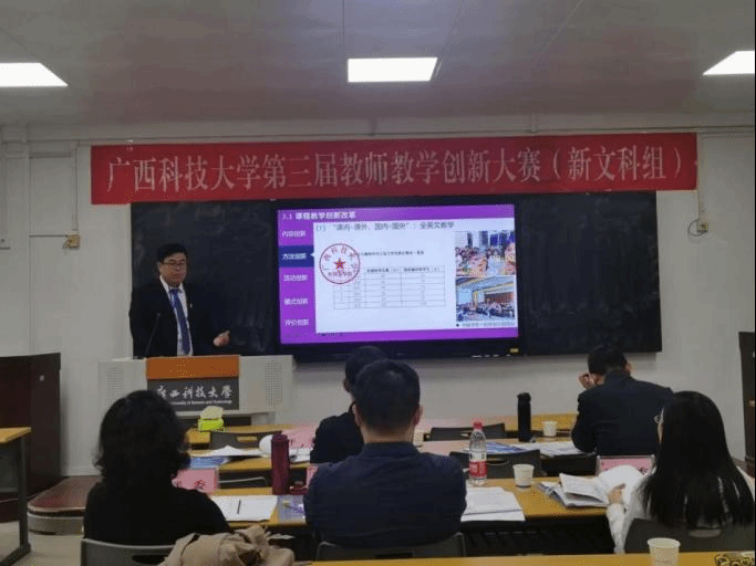 近日,学校举办了广西科技大学第三届教师教学创新大赛。经各教学单位推荐,评委专家根据课堂教学实录视频、教学创新成果报告、教学设计创新汇报三部分进行综合评定,参赛的新工科、新文科、基础课程、课程思政等4个组别共评出一等奖7名、二等奖7名、三等奖2名、优胜奖5名、优秀组织奖3个。我院周照兴教师团队的《国际贸易实务》荣获新文科组一等奖;刘彦臻教师团队的《计算机辅助翻译》、陈宜凝教师团队的《大学英语A3学术英语(医学)》、张杰教师团队的《大学英语A2(学术英语阅读)》荣获新文科组二等奖;罗卓琳教师团队的《大学英语》荣获新文科组优胜奖。外国语学院积极组织教师参赛,成绩突出,被授予“优秀组织奖”。
