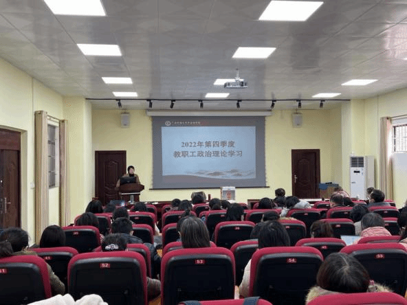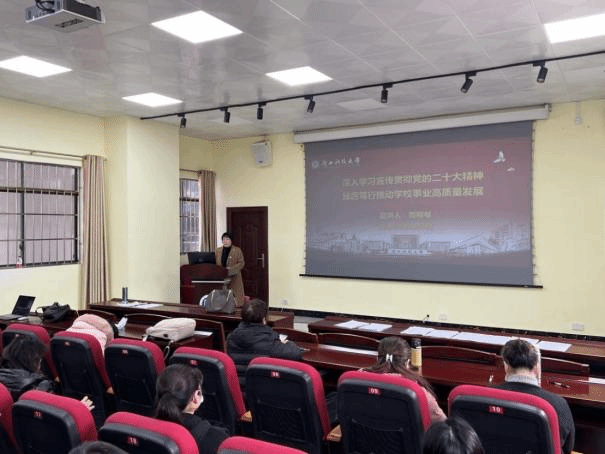 12月6日下午,外国语学院在东环校区基础实验楼106教室召开2022年第四季度教职工政治理论专题学习会,院长周柳琴以《深入学习宣传贯彻党的二十大精神,踔厉笃行推动学校事业高质量发展》为题,专题宣讲党的二十大精神,全体教职工参加了本次学习会。