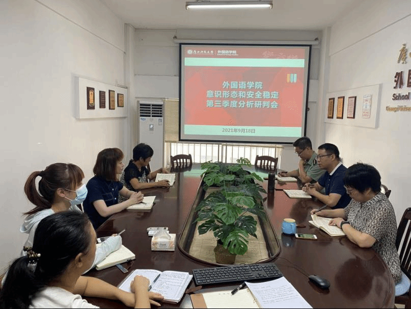 9月18日上午,外国语学院在学院会议室召开意识形态与安全稳定工作专题会议暨第三季度形势分析研判会。学院领导班子成员、院办主任、团委书记、辅导员参加会议。会议由学院党总支书记陈志波主持。