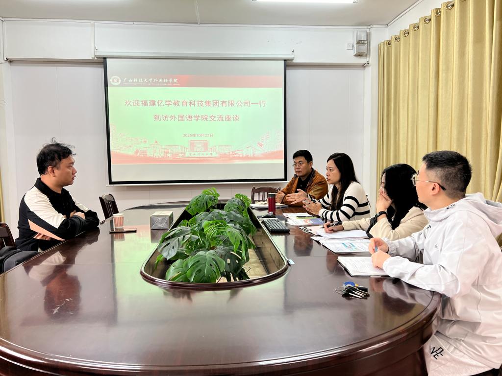 10月22日上午,福建亿学教育科技集团有限公司陈竑宇经理到访外国语学院,与副院长谭玮及商务英语类课程组教师围绕“以赛促学”“课程实训平台搭建”“实习就业”三大核心议题,展开务实高效的交流,为深化校企协同育人、赋能英语专业人才培养注入新动能。