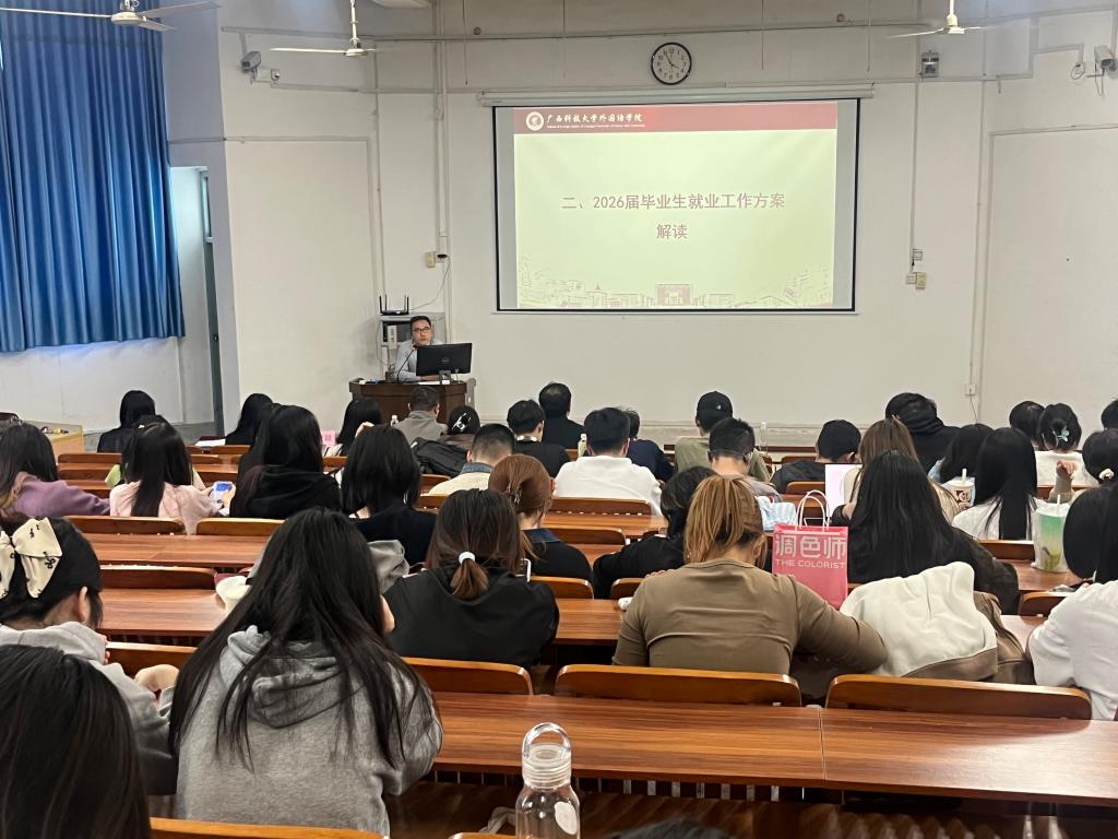 10月28日下午, 外国语学院2026届毕业生就业工作动员大会在二教114召开。学院党委副书记黄大志、团委书记吕舒颖、志公教育培训讲师张昆毅及2026届毕业班班主任出席,2026届全体本科生、研究生参加活动,辅导员梁艺静主持活动。